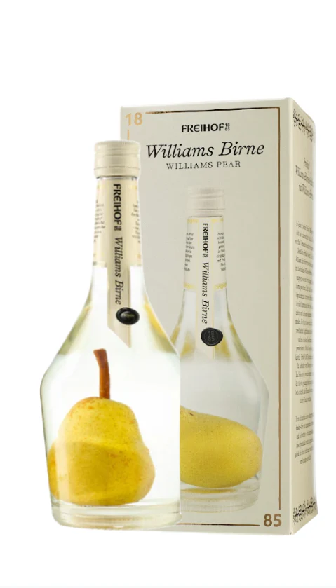 Freihof Williams Birne Met Peer is een vruchtenlikeur afkomstig uit Oostenrijk. De drank is helder van kleur. Je zult een aanwezige peer toon in zowel de smaak als aroma opmerken. Ook in de fles kun je een hele peer zien drijven. 35%. Lees meer